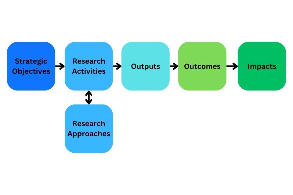 This theory of change summarises how Defra’s strategic objectives inform our research activities and approaches (figure 10). These research activities generate outputs which then deliver our intended outcomes and impacts.