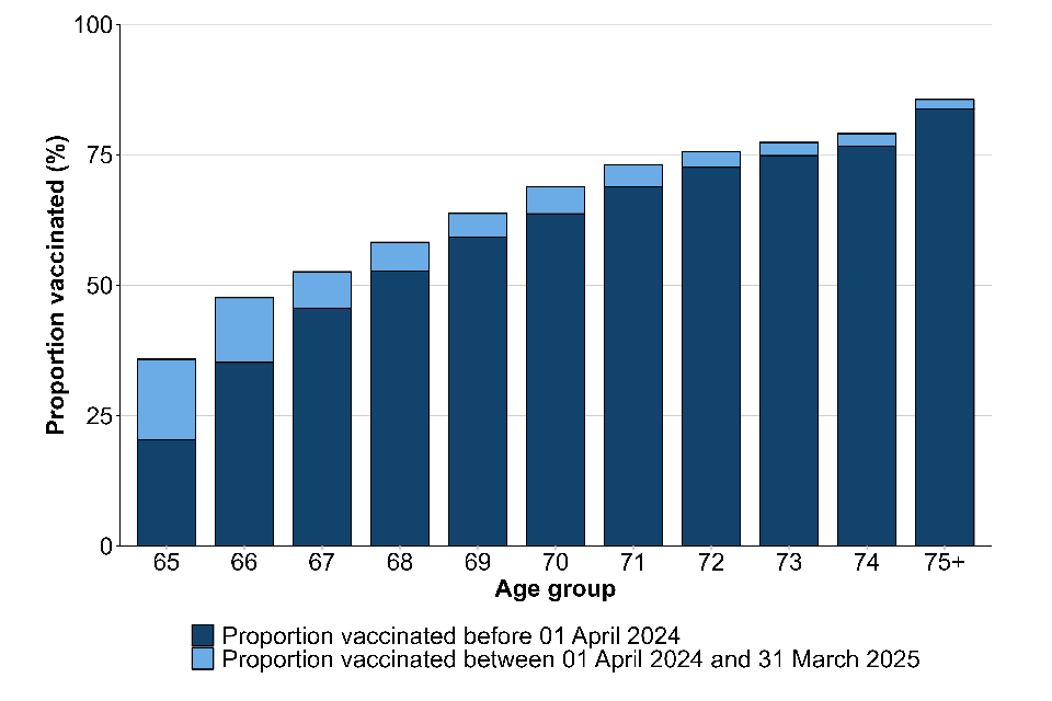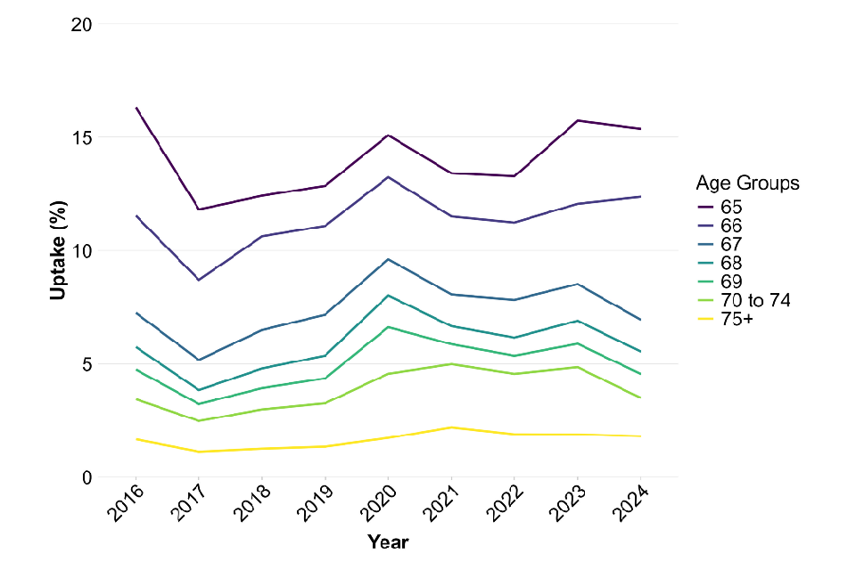 Uptake was 15.4% in those aged 65 who had recently become eligible for the vaccine (Table 1). Uptake in those aged 65 decreased by 0.3 percentage points between financial years 2023/24 and 2024/25 (Figure 3).