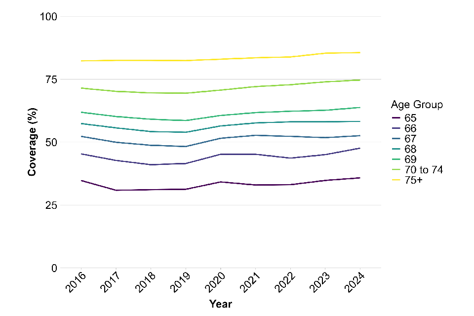 Coverage gradually increased with age, rising from 35.8% in those aged 65 to 85.6% in those aged 75 and over (Figure 1).