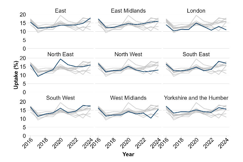 Uptake is the proportion of those eligible who have been vaccinated in the last year. This provides an indicator of vaccination activity in 2024/25 and shows how long after becoming eligible individuals are receiving the vaccine.