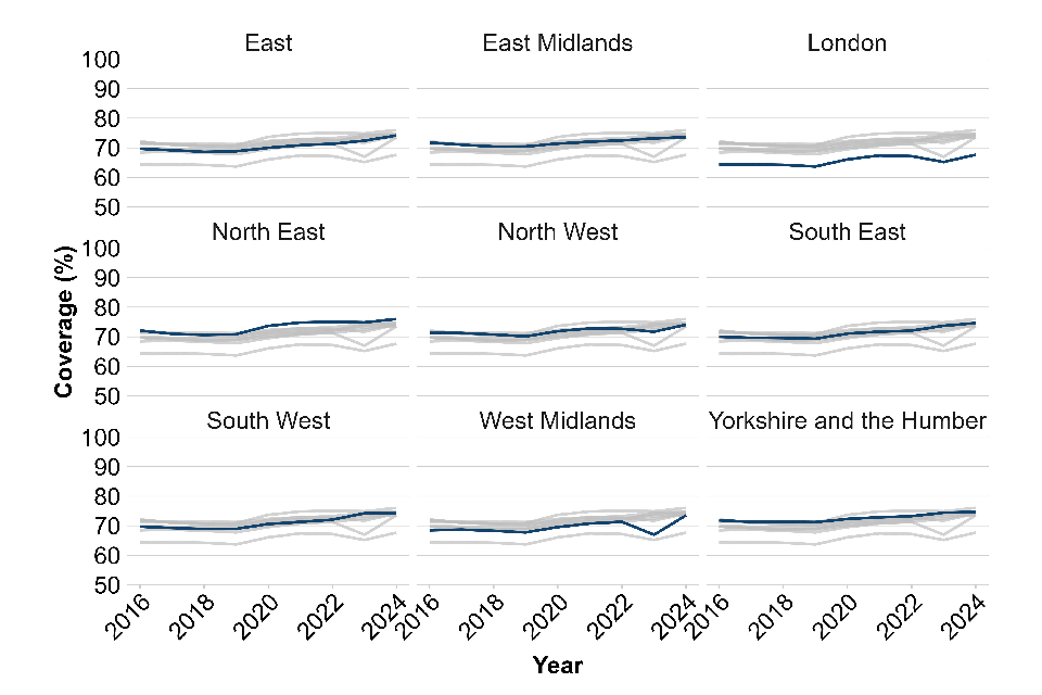Coverage in those aged 65 and over increased by 0.5 percentage points between financial years 2023/24 and 2024/25 (Figure 2).