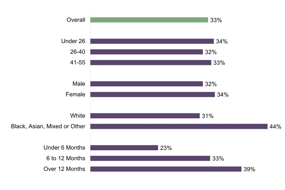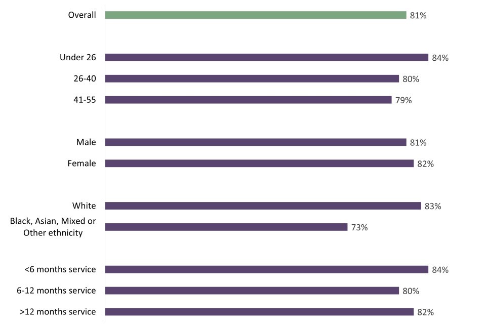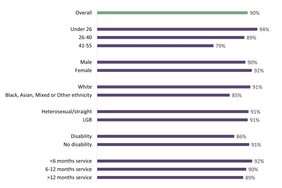 Base: Overall respondents (1,842); Under 26 years (800); aged 26 to 40 (909); aged 41 to 55 (132); Male (1055); Female (769); White (1685); Black, Asian, Mixed or Other ethnicity (138); Disability (153); No disability (1659); Heterosexual or Straight (1626); LGB (165); Less than 6 months service (343); 6 to 12 months service (989); More than 12 months service (510)