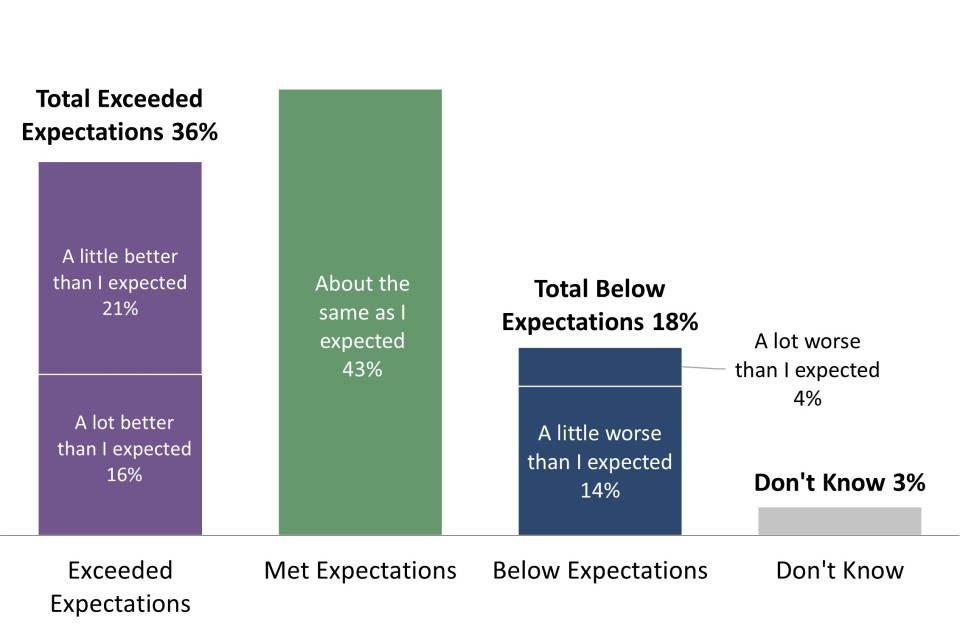 Almost eight in ten new officers indicated their job as a police officer had met or exceeded their expectations prior to joining. More than a third of new recruits suggested the role exceeded their expectations (21% a little better than they expected and 16% a lot better than they expected).