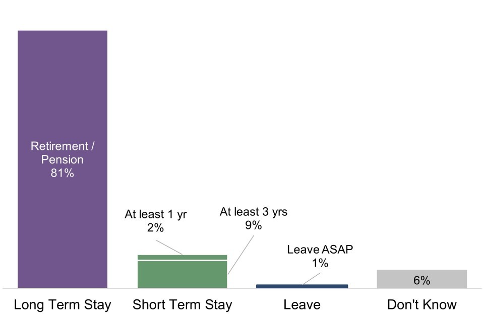 Nine in ten new officers indicated they intend to stay in their role for the next three years or more, with the vast majority intending to stay until retirement or pension age. Only 1% of new officers expressed a clear intention to leave their role in the near future.