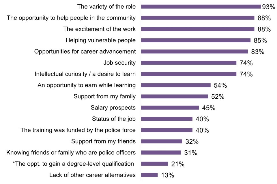 Variety, excitement, helping people in the community and career opportunities were the most influential factors for new officers when deciding to join the police service. Other factors, such as salary prospects, the status of the job, knowing existing police officers and support from family or friends, were less influential.