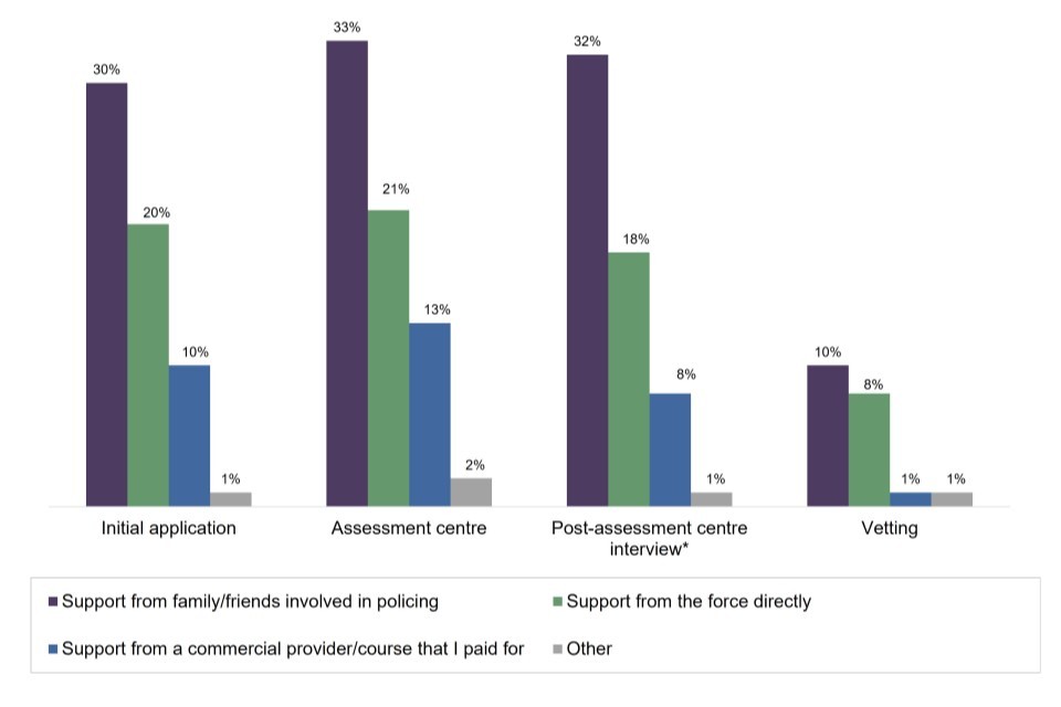For those that received support, at each recruitment stage family and friends involved in policing were the most likely source, followed by the force itself and then commercial providers.