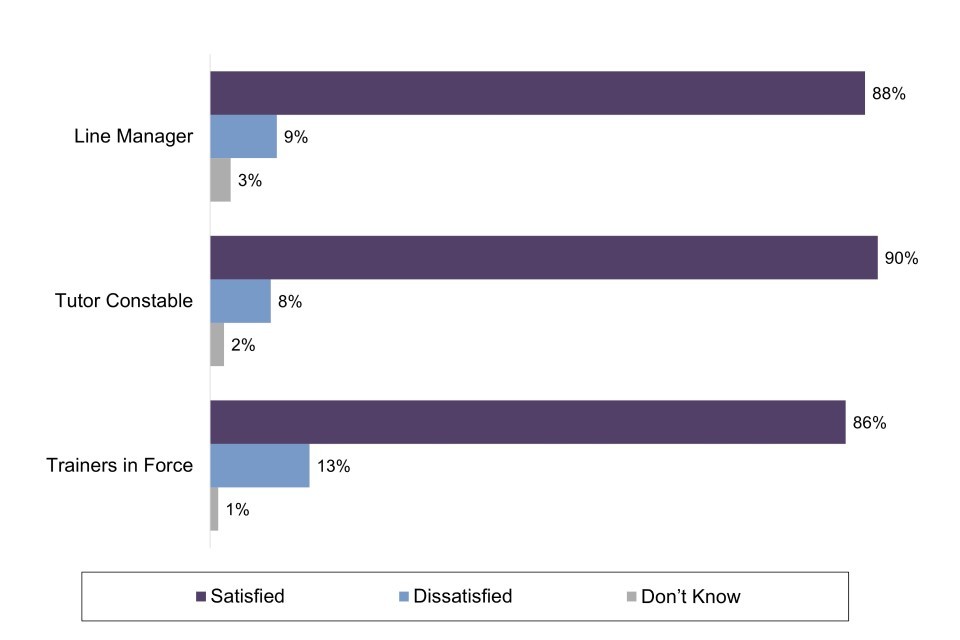 Satisfaction with the support received from superiors was consistently high. More than 85% of new recruits were satisfied with the level of support they had received from their line manager, tutor constable and trainers in their force. Tutor constables generated the highest levels of satisfaction amongst new officers.