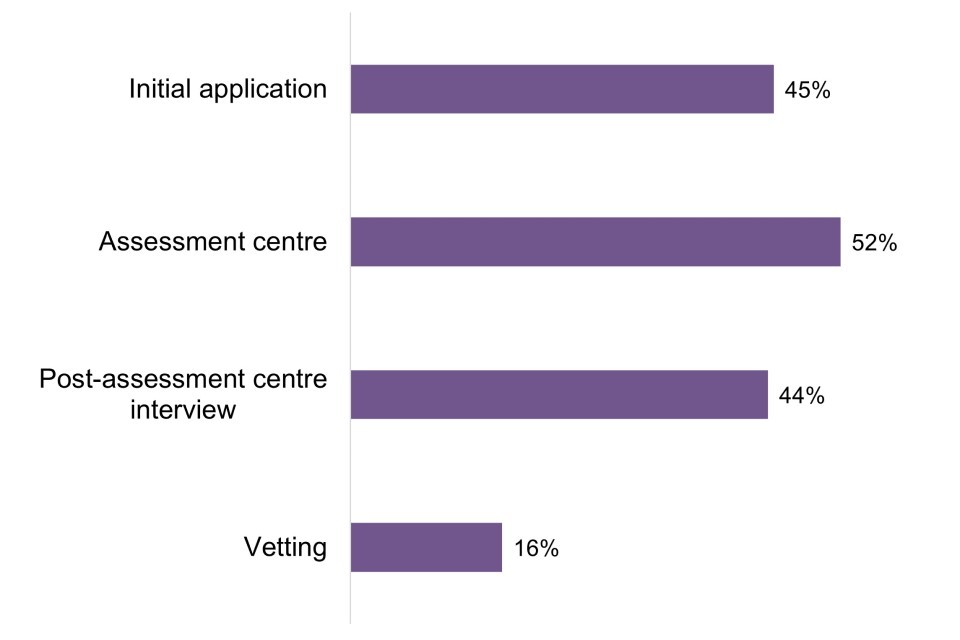 More than half of new police officers received support to prepare for the assessment centre, while just under half received support at the application and post-assessment centre interview stages. A smaller proportion of around one in six received support with vetting.