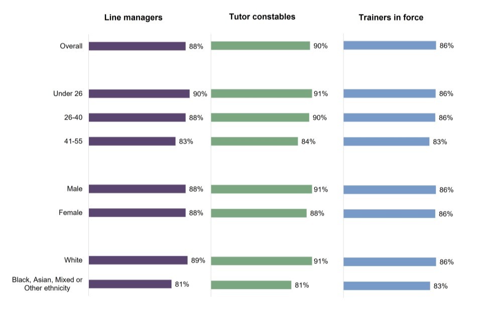 There were consistently high levels of satisfaction with line managers, tutor constables and trainers in the force across all sub-groups, dropping slightly for officers over the age of 40 and ethnic minority officers.