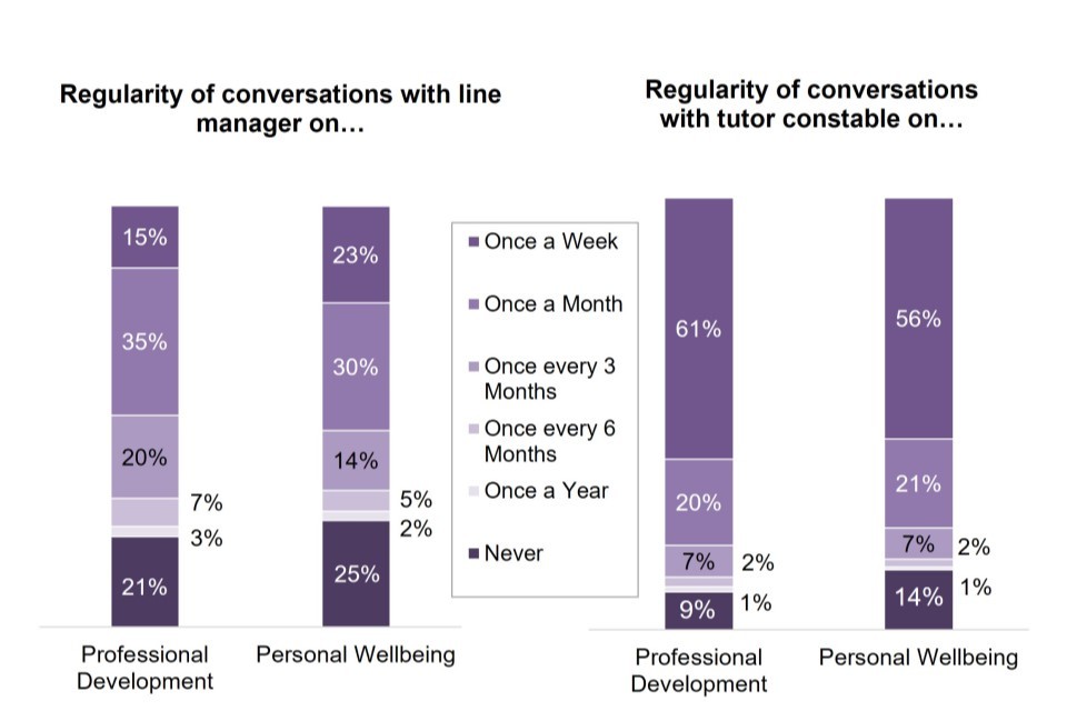 Conversations about professional development and personal wellbeing occur much more frequently with tutor constables than with line managers. Around eight in ten new officers reported having at least a monthly conversation with their tutor constable about their professional development and personal wellbeing. Around half of new officers were having these conversations at least monthly with their line manager. More than one in five new officers have never had these conversations with their line manager.