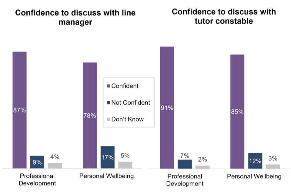 The proportion of new officers that felt confident in discussing their professional development and personal wellbeing with their superiors was generally high. When asked about professional development in particular, around nine in ten new officers felt confident discussing this with their line manager (87%) or tutor constable (91%).
