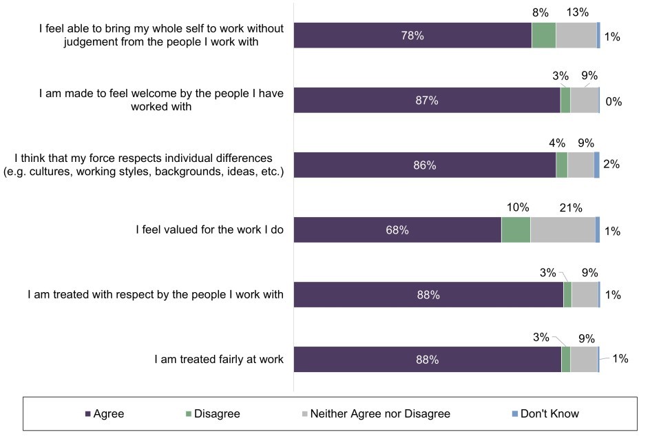 A high proportion of new officers felt respected, welcomed, treated fairly and able to bring their whole self to work. When asked if they felt valued for the work that they do, new officers were positive overall, but less so than for other inclusion statements. Over two-thirds (68%) of new officers agreed they feel valued, but a significant minority either disagreed (10%) or opted to neither agree nor disagree (21%).