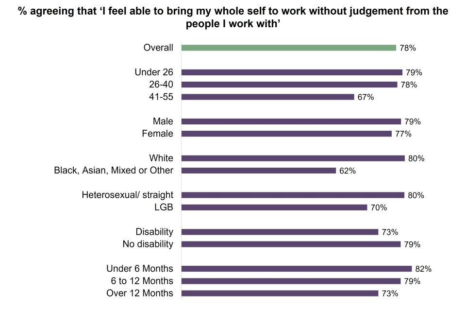 Most new officers across all sub-groups agreed they can bring their whole self to work without judgement. However, officers who identified as LGB, officers with a disability, officers over the age of 40 and officers from ethnic minority backgrounds were all less likely to agree.