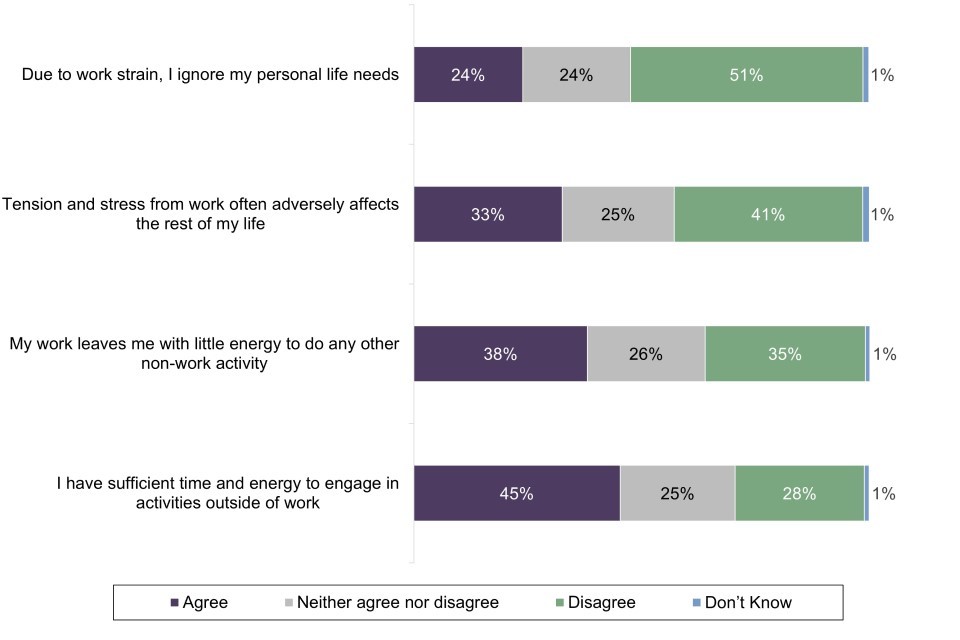 A third of new officers reported that tension and stress from work adversely affects the rest of their life. A quarter ignore needs in their personal life due to work strain, while nearly four in ten reported that work leaves them with little energy to do any other non-work activity. Just under half felt they have sufficient time and energy to engage in activities outside of work.
