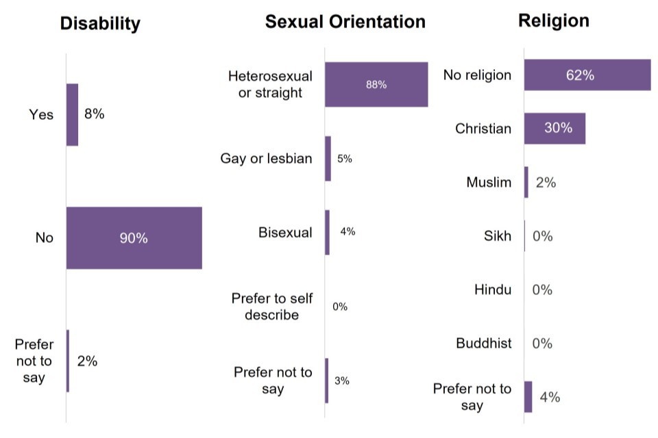 When asked about their sexual orientation, 88% of new recruits reported identifying as ‘Heterosexual or straight’. A further 5% of recruits identified as ‘Gay or lesbian’, 4% identified as ‘Bisexual’, and fewer than 1% chose to ‘Self-describe’ their sexual orientation in another way.