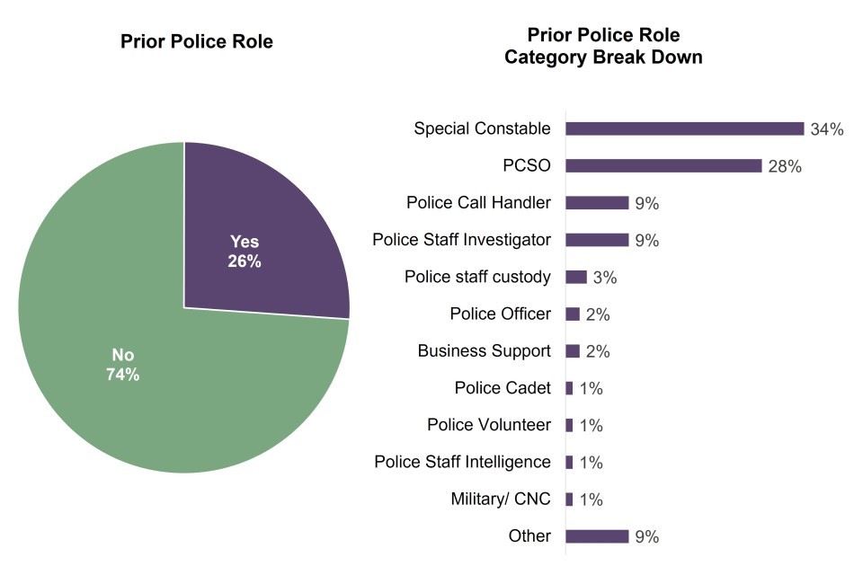 A quarter of new police officers had previously held another policing role before becoming a police officer. New officers have come from a wide range of other policing roles, but the most common route was having previously been a Special Constable or Police Community Support Officer (PCSO).