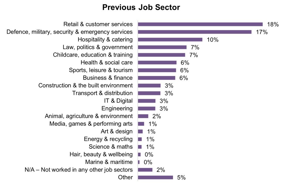 New police officers had a wide variety of job roles immediately before becoming police officers, with the most common job sectors being ‘Retail & customer services’ (18%) and ‘Defence, military, security & emergency services’ (17%).