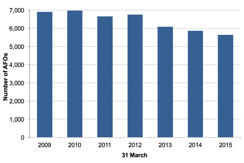 There were 5,647 AFOs on 31 March 2015. This represents a decrease of 4% (-217) when compared with the previous year and a decrease of 18% (-1,259) from 31 March 2009. As figure 2 shows, the number of AFOs was at its highest on 31 March 2010 (6,976) and has since been on a general downward trend. However, there was a slight increase in the number of AFOs on 31 March 2012.