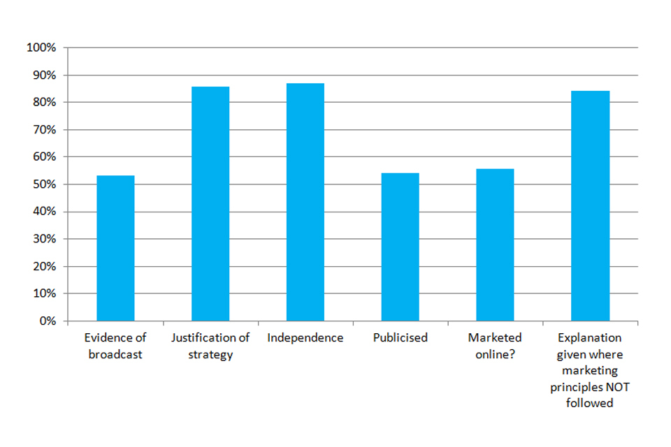 Although evidence shows increased marketing activity is being undertaken, our review has found that compliance with the ‘6 principles of marketing’ varies widely between insolvency practitioners and from case to case. It is notable that there was greater than 80% compliance in respect of 3 of the principles, but the principles that encourage exposure of the business to the market “publicised” (54% compliance) “broadcast” (53% compliance) and “marketed online” (56% compliance) have only been complied with in just over 50% of cases. See Chart 2 for a breakdown of compliance per marketing principle.