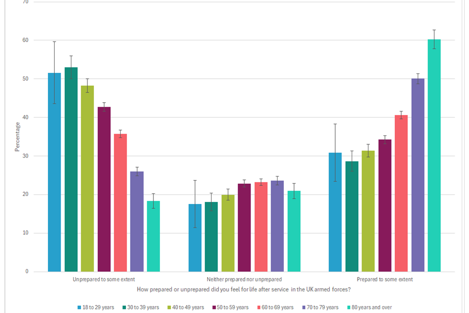 Weighted percentage of veterans by how prepared or unprepared they felt for life after service by age. Veterans’ Survey 2022, UK.