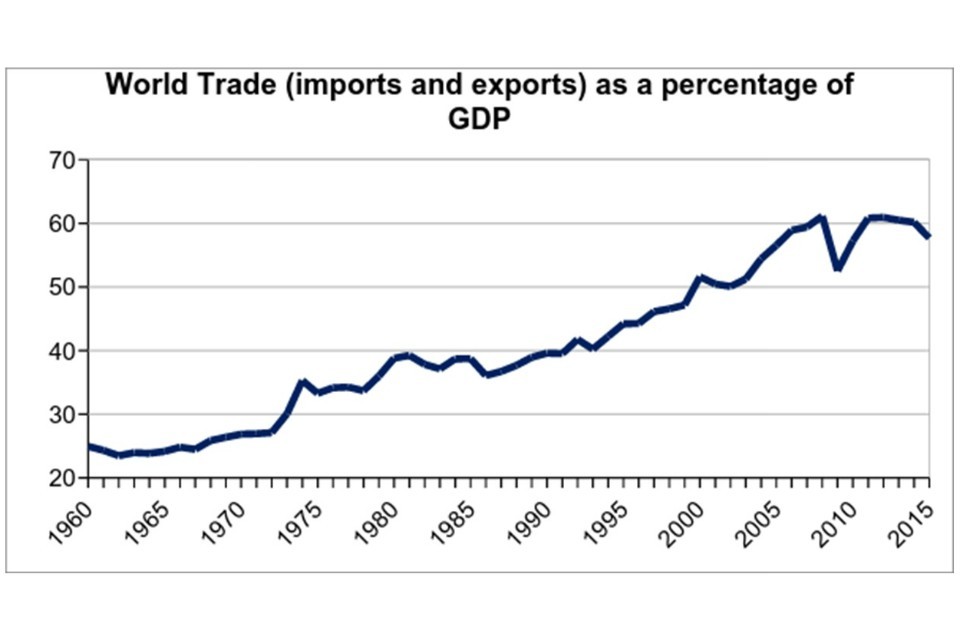 Over the last half century, trade has become increasingly important. Liberalisation has made trade cheaper and more predictable. Technological progress has made trade easier. As a result, global goods exports are now 38 times higher than they were in 1950[footnote 6] and as the chart below shows, world trade as a percentage of the global economy has more than doubled since 1960.