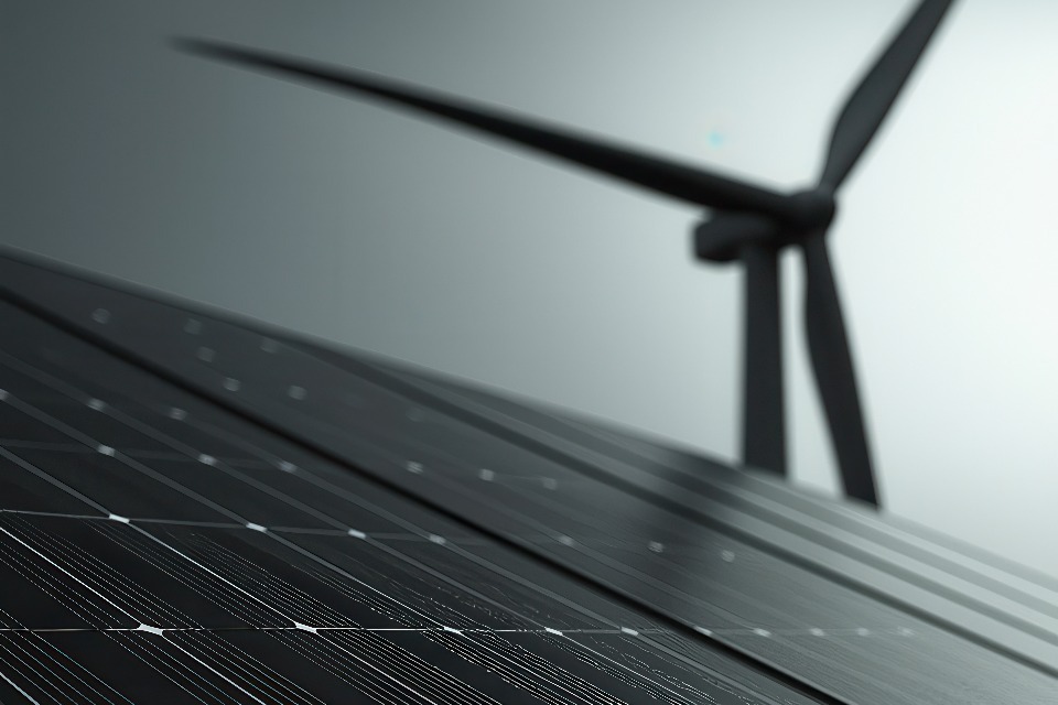 A close-up of solar panels with a wind turbine in the background, representing clean energy technologies and the shift towards sustainable, renewable power sources.