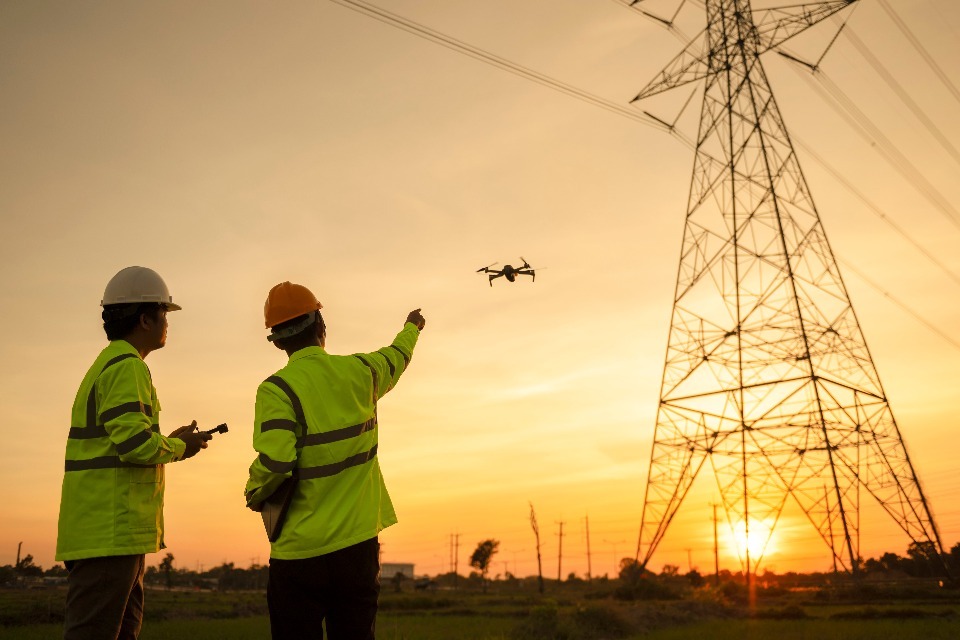 Two people in high-visibility jackets and hard hats operate a drone near a pylon. One controls the drone while the other points skyward.