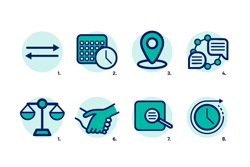 Eight icons are arranged in two rows. Top row: bidirectional arrows, calendar with clock, location pin, and linked speech bubbles. Bottom row: justice scales, handshake, magnifying glass over a document, and a clock with a circular arrow. Each icon represents the 8 principles.