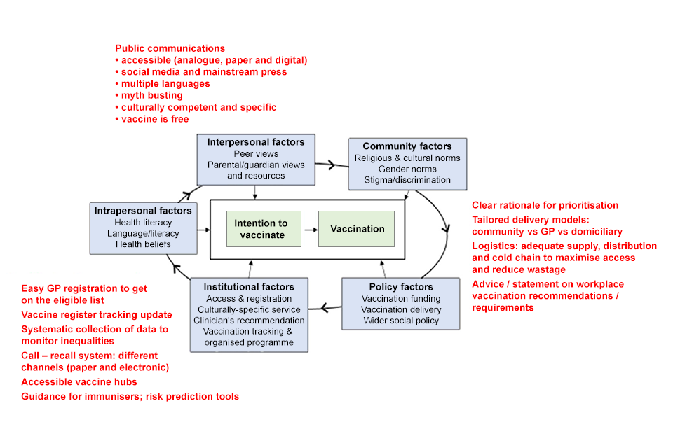 A socioecological model of factors influencing inequalities in vaccination uptake has been developed (figure 1) based on the audit’s findings. This model provides a framework for actions to mitigate inequalities which can be applied to the COVID-19 immunisation programme. For example, intrapersonal and interpersonal factors such as vaccine beliefs around safety should be addressed through a communications strategy that is culturally competent and specific, with resources in multiple languages, and using several media (to avoid digital exclusion). To ensure equitable access for groups where mobility may be a challenge (for example elderly and those with physical disabilities), who have poor access to traditional health services, or are essential health and care staff, a policy of multiple models of vaccine delivery (such as domiciliary, community hubs, GP, secondary care and outreach) should be considered. Programmes targeting working-age adults, for example for influenza, are usually easier to deliver through occupational settings (such as NHS trusts) and achieve higher vaccine uptake, including in BAME staff through occupational health risk assessments; this delivery model also allows for large volume of stock to be held at vaccination sites with high footfall which can reduce wastage if multi-dose vials are used.