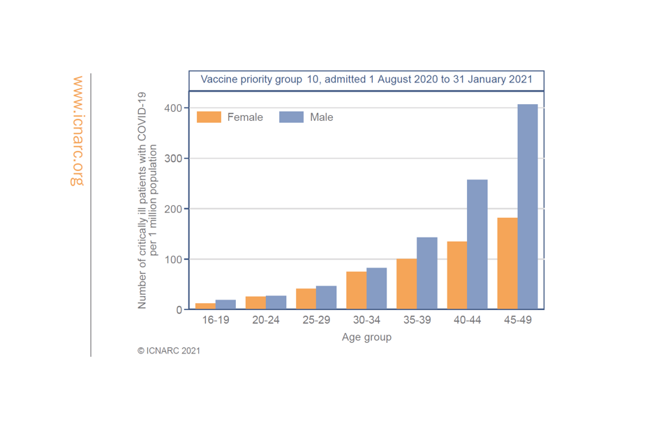 The chart shows the profile of critical care admissions with COVID-19: 1 August 2020 to 31 January 2021. The number of critically ill patients with COVID-19 per 1 million population is highest in those age 40 to 49 years, and declines with reducing age. Rates are higher in males than females.
