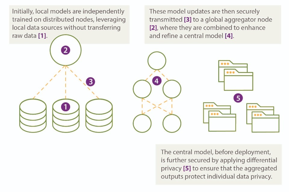 Implementation: TEEs can be used to create a secure local environment for each node participating in federated learning. This ensures that intermediate computations on local data are securely isolated within a server enclave. While federated learning inherently prevents other parties from accessing local raw training data by sharing only model weight updates, TEEs add an additional layer of security.