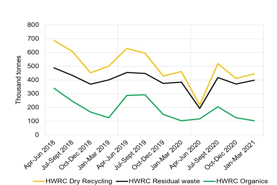 As well as the closure of HWRCs during the COVID-19 pandemic, many local authorities reported the suspension of garden waste collections due to prioritisation of other more critical services. It is likely that some of this organic waste may have been put into the residual waste stream.