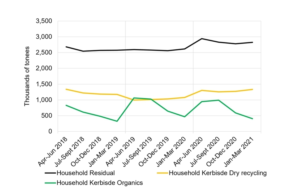 Figure 2 is a line chart to show the quarterly kerbside collection tonnages by waste stream in England for April 2018 to March 2021. The horizontal axis runs from April to June 2018 to January to March 2021. The vertical axis shows the collected tonnage and runs from 0 to 3,500,000 tonnes. It shows large increases in the quantity of waste collected kerbside from households.