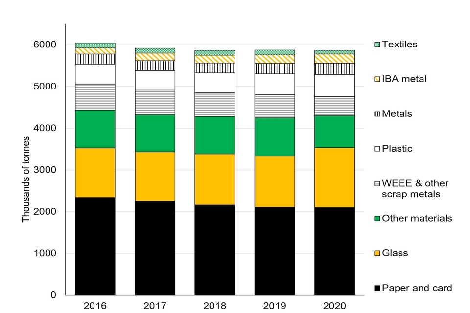 The tonnage of dry recycling, which includes paper and card, glass, plastic, waste electrical and electronic equipment (WEEE), and scrap metals including those reclaimed from incinerator bottom ash, as well as other materials remained at around 5.9 million tonnes in 2020. However, as a proportion of total 'waste from households', it was still down from 2019 at 26.0%.