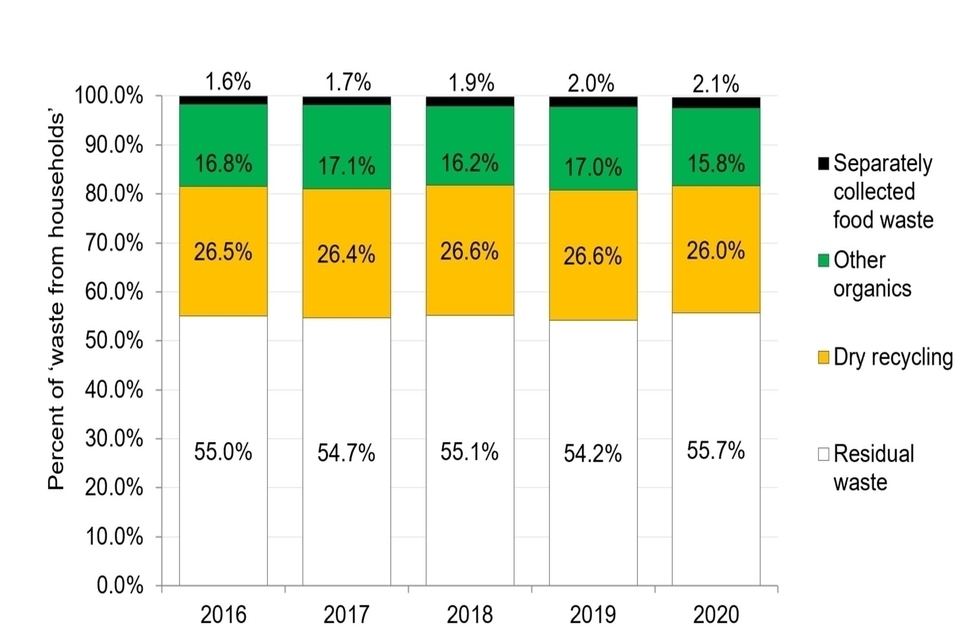 Figure 3 illustrates the overall 'waste from households' composition in England from 2016 to 2020.