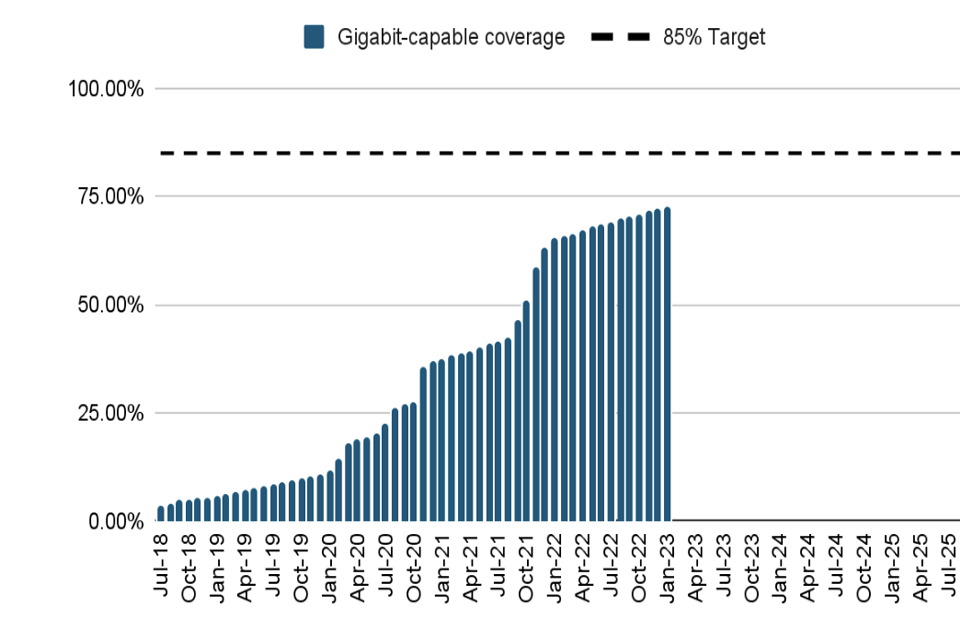 UK gigabit-capable coverage trajectory (Source: DSIT analysis, ThinkBroadband. Data is accurate as of 7 January 2023.)