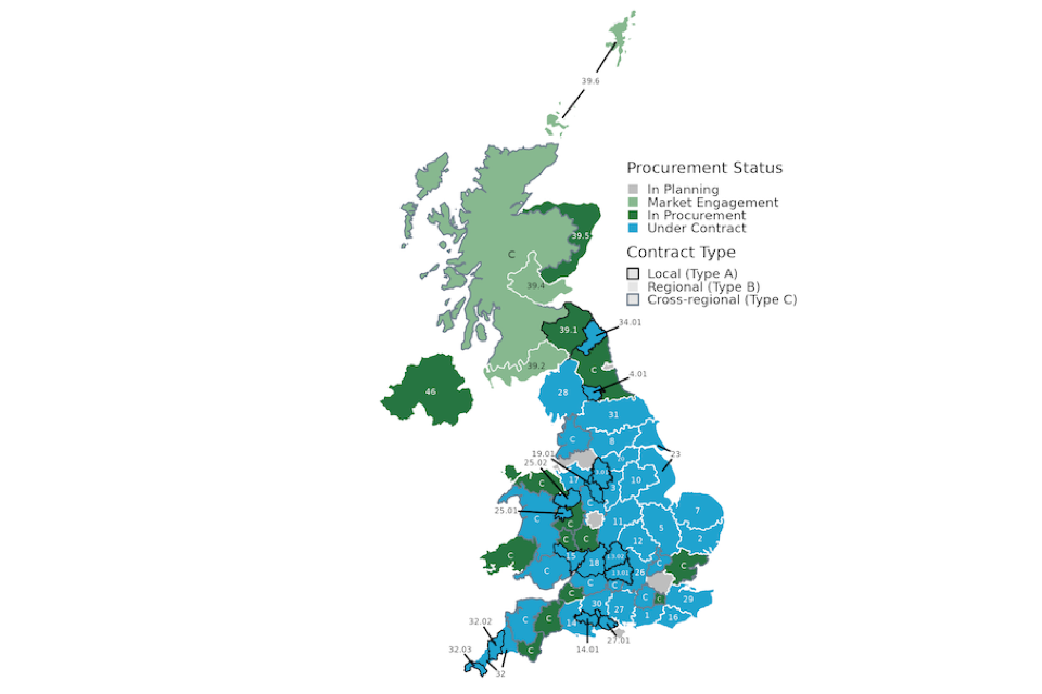 | Local, regional or cross regional procurement | Area and Lot number | Procurement start date | Estimated contract award date (subject to change) | Number of premises in scope of the procurement (subject to change) | Indicative contract value (£ million) (subject to change) |