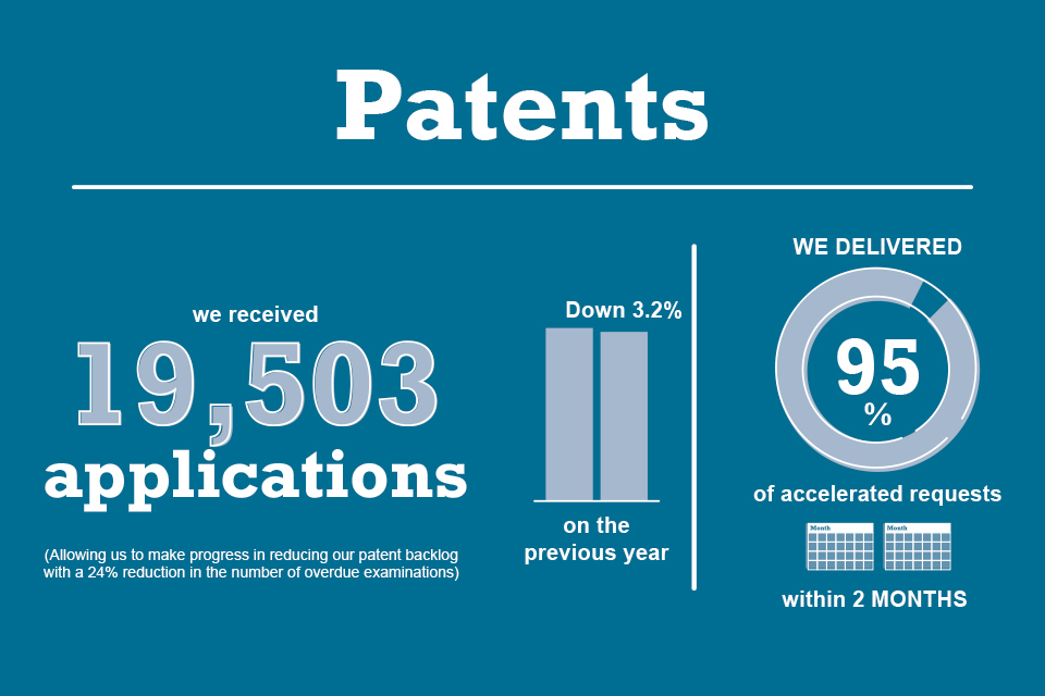 In patents, we met 95% of requests for accelerated processing of patents within two months and continued to reduce our examination backlog by 24%.