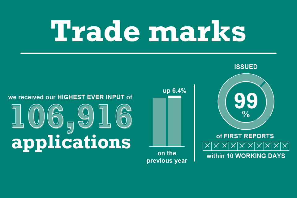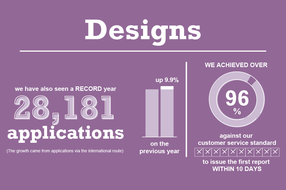 Designs have also seen a record year, an overall increase of 9.9% for designs with 28,185 applications. The growth came from applications via the international route. We achieved our target to issue the first report within 10 days in 96% of cases.