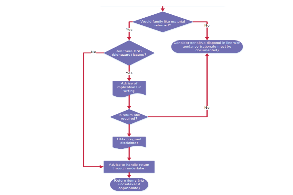- Return of material to the next of kin or personal representative/s for burial or cremation; or