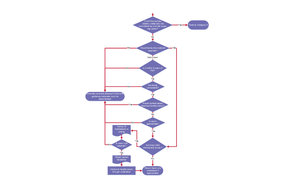 Material no longer required for a criminal justice purpose is divided into three categories as per the Forensic Science Regulator’s guidance. How material is disposed of depends on which category the material falls into and each should be considered on a case-by-case basis. The flowcharts attached, in conjunction with the National Decision Model, will assist in the decision-making process.