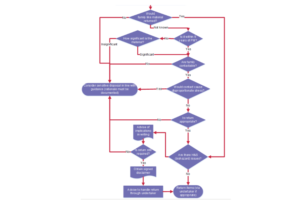 In any event, material should not be disposed of without prior consultation with the coroner who may wish to retain it for the purpose of their duties at an inquest.