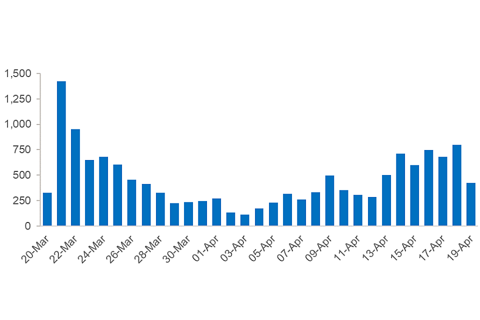 A chart showing how the daily number of complaints received through the CMA’s online form have been higher in the week to 19 April than the previous seven-day period; but lower than levels seen in the days after the Taskforce launched on 20 March.