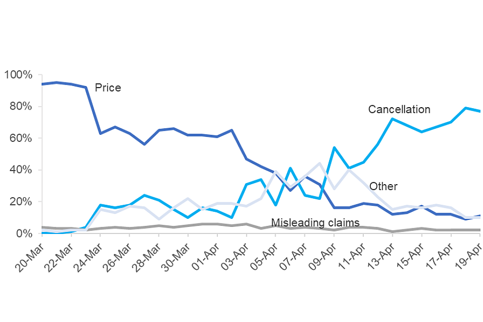 A chart showing how a large proportion of complaints received by the Taskforce were initially about high prices; but that since the beginning of April, complaints about cancellation have been rising, and they are now the most common complaint.