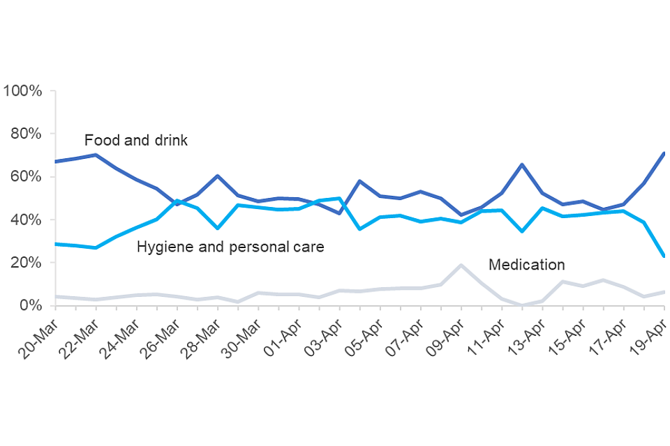 A chart showing how the three product categories of price increase complaints (food and drink; hygiene and personal care; and medication) have remained relatively stable since 20 March, with food and drink fluctuating above hygiene and personal care.
