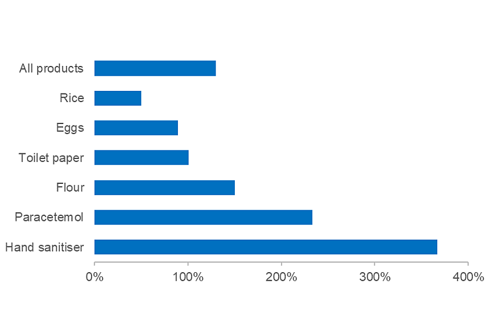 Since 3 April, the CMA has asked those reporting unfair price increases to specify, where possible, the original price and the raised price. The chart below shows the average (median) price increase across the 430 complaints that reported ‘before’ and ‘after’ prices, and the increase for some individual products. While total numbers of complaints have decreased, the CMA is still receiving reports of notable price rises, including in the past few days.