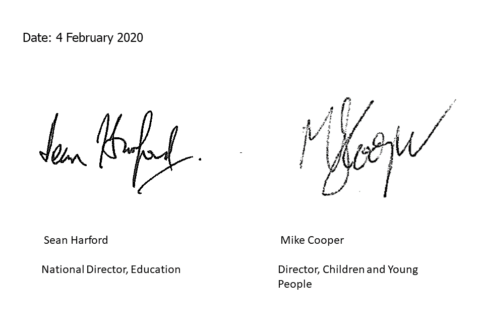 Authorisation signatures from Sean Harford, Ofsted and Mike Cooper, MoD dated 4 February 2020.