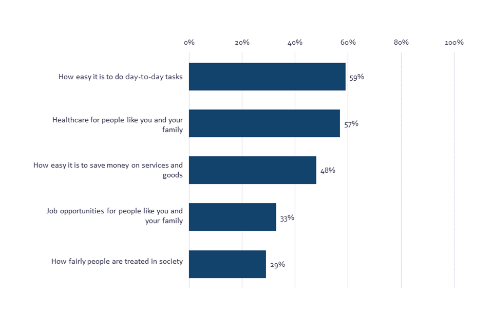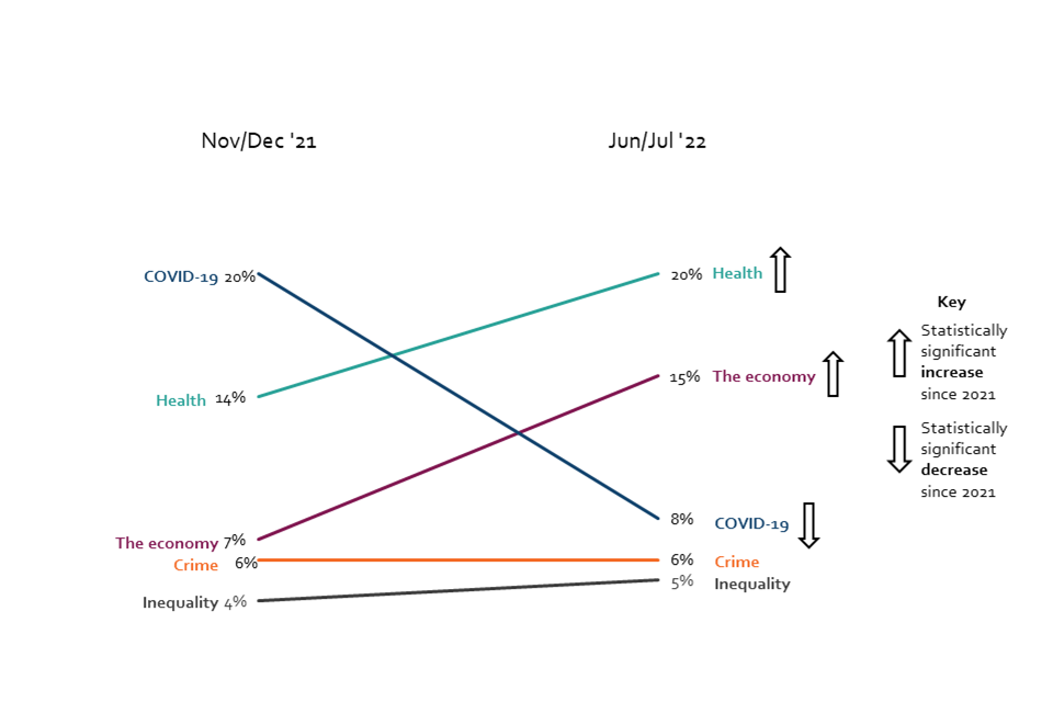 There were also several respondents (112) that selected ‘other’ issues that they feel the country is facing, choosing to fill in an elective open-text box. A high proportion of these (67% of all ‘other’ responses) highlighted the ‘cost of living’ as a key concern. Although overall this comprises a small percentage of overall responses, the number of spontaneous mentions indicates it is at the forefront of the public’s mind.