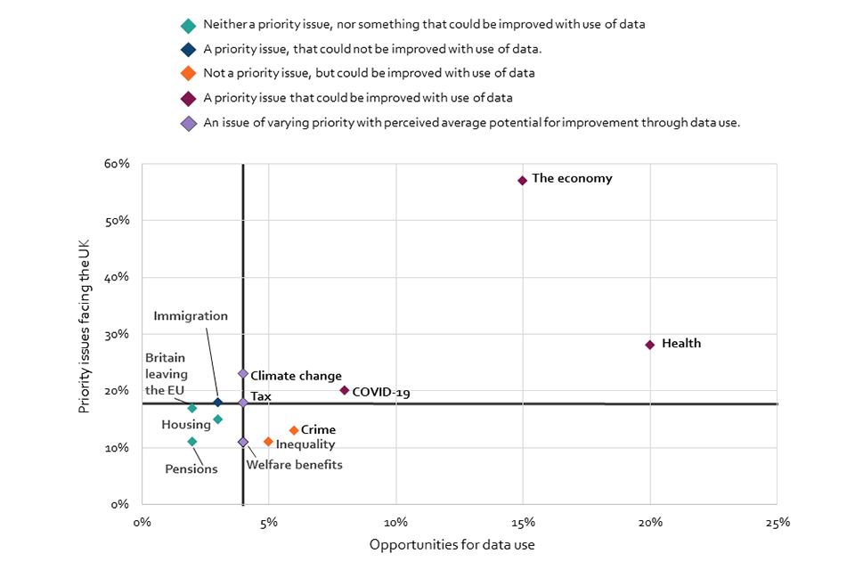 Scatter graph showing the relationship between the most important issues facing the country and the issues presenting the greatest opportunity for data use to benefit the public. The economy and health stand out as the top issues across both metrics.