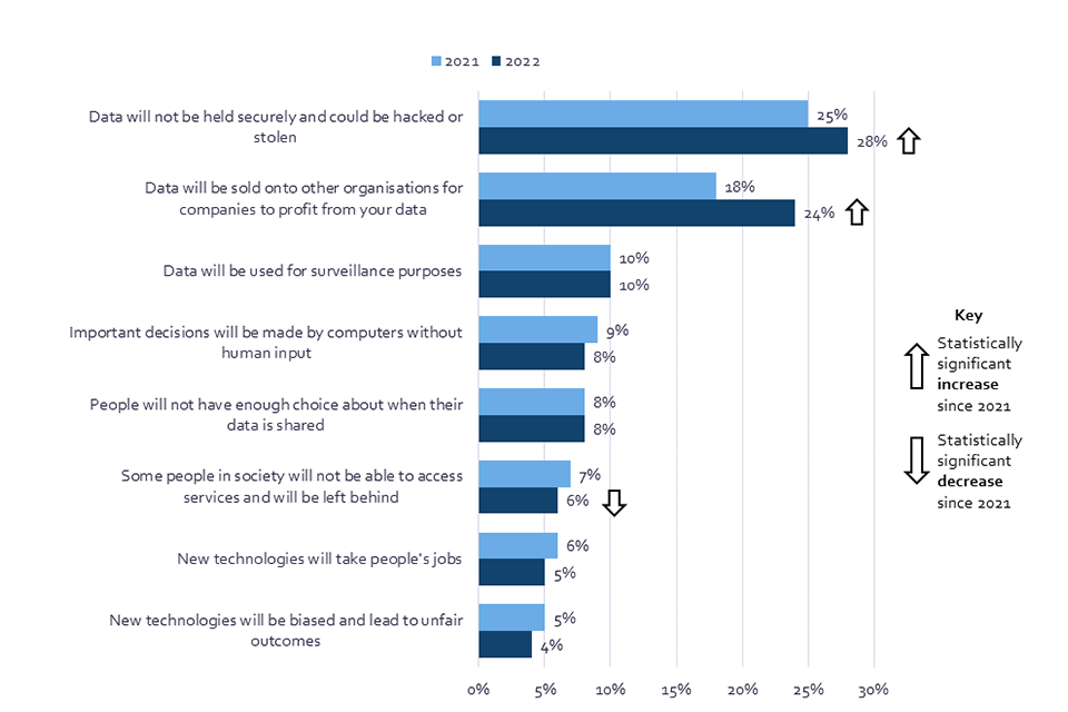 The main perceived risks associated with data use are related to data security and selling data for a profit, both of which have increased in concern since the previous wave of research in 2021. When the UK public was asked to select the greatest risk for data use in society from a list, 28% expressed concern that data will not be held securely and could be hacked or stolen, compared with 25% in 2021, while 24% selected ‘data will be sold onto other organisations for companies to profit’ as the greatest risk, compared with 18% in 2021[footnote 3]. Both of these concerns are especially high amongst those who are aged over 55 (for ‘data will not be held securely’: 32% of those aged 55+, compared to 23% of those aged 18-34; for ‘data will be sold onto other organisations or companies to profit’: 28% of those aged 55+, compared to 21% of those aged 18-34).